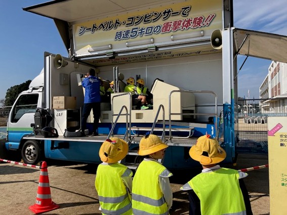 『シートベルトコンビンサーのたいけんで5キロメートルなのに、すごいしょうげきでした。そして、しっかりシートベルトをしめたいと思いました。